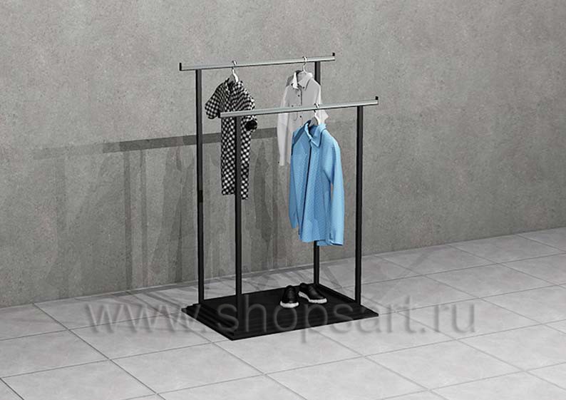 Стойка ЛОФТ, островная со штангами и полочками предназначена для демонстрации одежды и выкладки товара. Состоит из двух секций, имеет в своей конструкции штанги с двойной навеской для вывески одежды на плечиках и полочки для выкладки товара из трикотажа. Каркас стойки изготавливается из сварной квадратной трубы 25х25 мм. с покрытием порошковой краской чёрного, матового цвета. Полочки изготавливаются из черного, матового ЛДСП 16 мм. В нижней части стойки устанавливается подиум для демонстрации обуви.