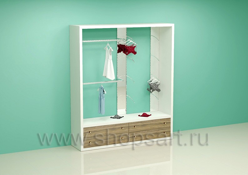 Стеллаж пристенный предназначен для демонстрации нижнего белья. Каркас изделия выполнен из белого, матового ЛДСП 16 мм. Задняя стенка стеллажа имеет декоративные зеркальные вставки, которые придают данному изделию глянец, позволяют создавать дизайнерскую выкладку товара, тем самым привлекая внимания покупателей. Стеллаж укомплектован «П» образными и фронтальными кронштейнами белого цвета, регулируемыми по высоте. В нижней части установлены накопители с выдвижными ящиками для хранения и сортировки товара, изготовленными из высокоглянцевого МДФ, цвет «под дерево».