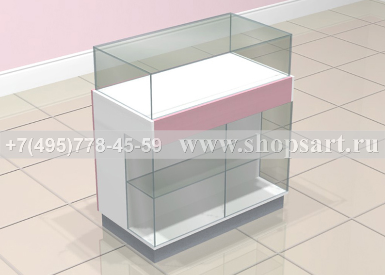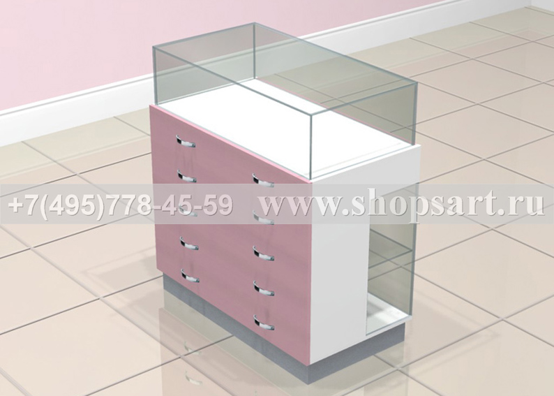 Торговый прилавок предназначен для выкладки, демонстрации и хранения товара, снабжен выдвижными ящиками на направляющих полного выдвижения. Прилавок имеет две стеклянные витрины: верхняя открывается с помощью каретки, нижняя имеет распашные дверки с замком. Основание прилавка изготовлено из ЛДСП. Данный прилавок для бижутерии имеет много остекленных поверхностей, удобен для просмотра товаров покупателями. Цоколь прилавка можно изготовить из металлизированного пластика.