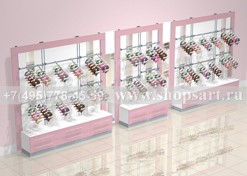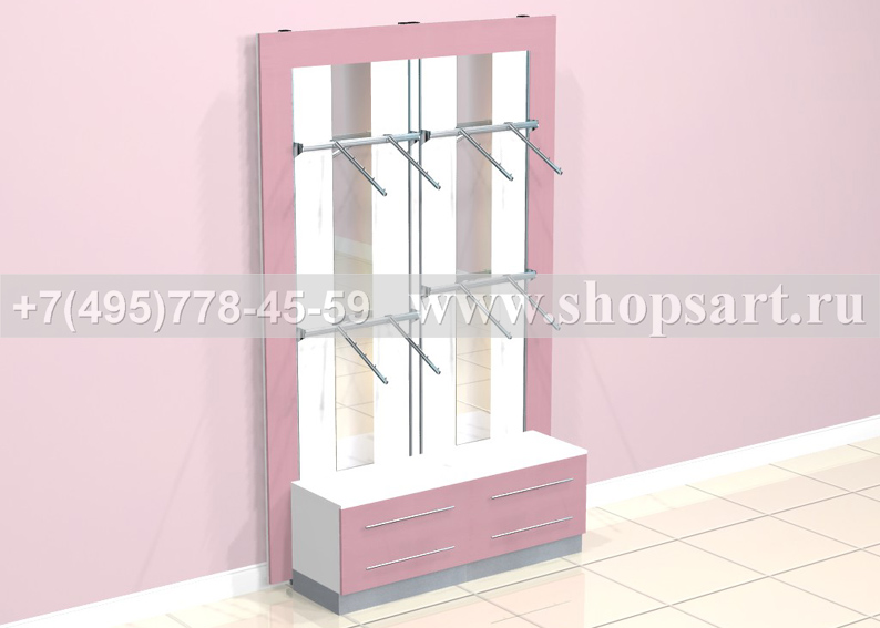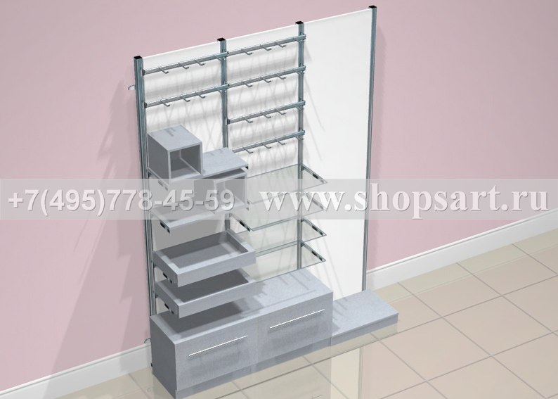 Стеллаж торговый, пристенный, используется для навески нижнего белья или одежды. В стеллажах использованы: стойки перфорированные 13х8х2250мм. или стойки 40х40х2400мм.; задние панели ЛДСП с зеркалами; накопители с выдвижными ящиками размером 500(h)х670/950х400мм.; кронштейны фронтальные 600мм., 900мм. или 1200мм., наклонные кронштейны, любые аксессуарами для навески и выкладки; полки из стекла, ЛДСП или МДФ различной глубины на полкодержателях; перфорированными стойками любой модификации. Перфорированные стойки могут устанавливаться на опоры и не нести нагрузку на стену, это важно для помещений, в которых не рекомендуется крепление к стене. Цоколь накопителей можно изготовить из металлизированного пластика.