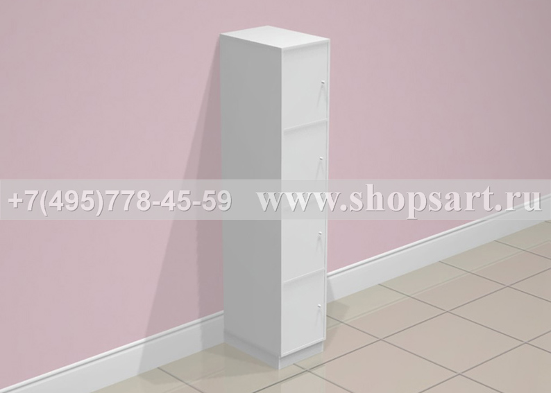 Стеллаж пристенный служит для хранения сумок. Стеллаж содержит распашные дверки. Каждая дверка снабжена замком с индивидуальным ключом. Для увеличения единиц хранения, можно расположить несколько стеллажей в ряд. Цоколь стеллажа можно изготовить из металлизированного пластика.