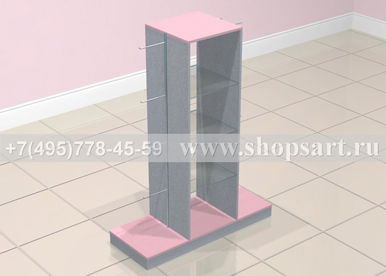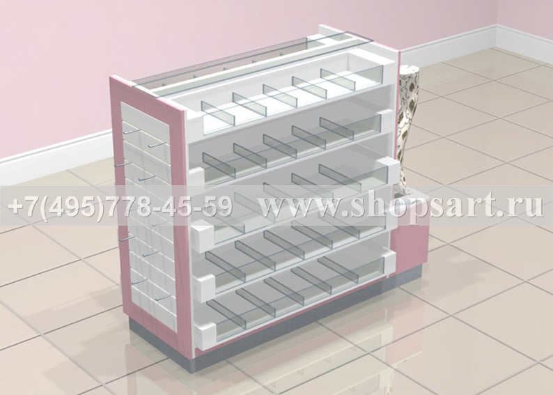 Стойка островная, торговая используется для выкладки и продажи колготок. Одна из основных стоек в магазинах самообслуживания. Устанавливается в центре зала. Стойка островная изготовлена из ЛДСП. Ячейки изготовлены из прозрачного стекла. Ячейки для колготок выдвижные. На боковых частях стойки располагаются экономпанель и зеркало, обрамленные рамкой розового ЛДСП. В нижней части расположен накопитель размером 400(h)х600х300мм. изготовленный из ЛДСП, с выдвижными ящиками на направляющих полного выдвижения. Цоколь островной стойки можно изготовить из металлизированного пластика. В верхней части стойки находится полка из стекла 8мм. Стойка очень вместительная, идеально подходит для продажи колготок.