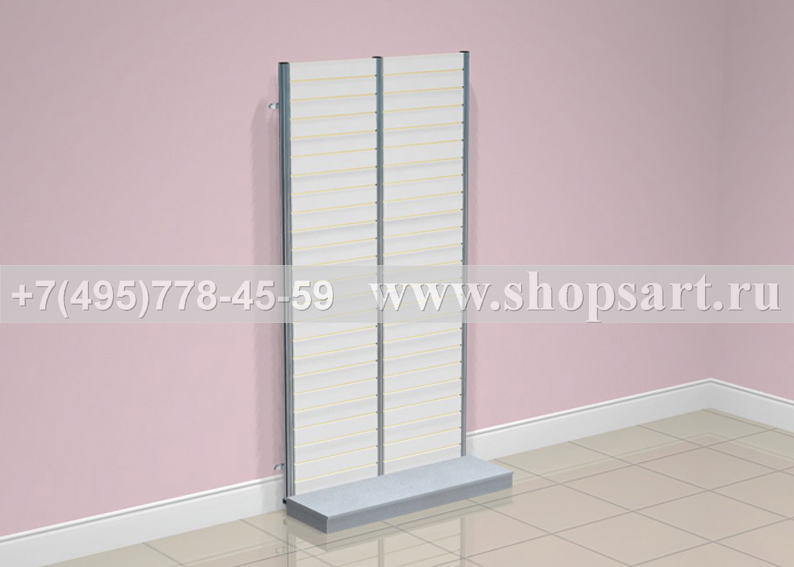 Стеллаж торговый, пристенный с экономпанелью используется для вывески мелкого товара. В стеллажах использованы: стойки перфорированные 40х40х2400мм.; экономпанели; подиумы размером 100(h)х600х400мм.; кронштейны фронтальные 600мм., 900мм. или 1200мм., наклонные кронштейны, любые аксессуарами для навески и выкладки; полки из стекла, ЛДСП или МДФ различной глубины на полкодержателях. Перфорированные стойки могут устанавливаться на опоры и не нести нагрузку на стену, это важно для помещений, в которых не рекомендуется крепление к стене. Цоколь подиумов можно изготовить из металлизированного пластика.