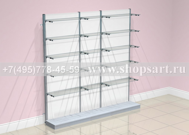 Блок стеллажей торговых, пристенных со стеклянными полками и экономпанелями используются для выкладки и навески белья, одежды, и других товаров. В модуле из стеллажей использованы: стойки перфорированные 40х40х2400мм.; экономпанели; 3 подиума размером 100(h)х600/900х400мм.; кронштейны фронтальные 600мм., 900мм. или 1200мм., наклонные кронштейны, любые аксессуарами для навески и выкладки; полки из стекла, ЛДСП или МДФ различной глубины на полкодержателях; перфорированными стойками любой модификации. Перфорированные стойки могут устанавливаться на опоры и не нести нагрузку на стену, это важно для помещений, в которых не рекомендуется крепление к стене. Цоколь подиумов можно изготовить из металлизированного пластика.