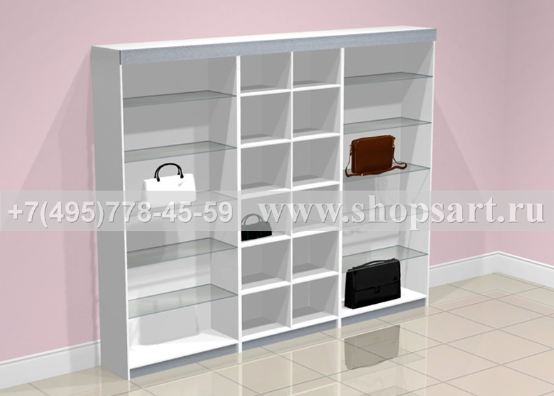 Шкаф торговый, пристенный для демонстрации сумок или постельного белья. Полки можно изготовить из стекла, ЛДСП или окрашенного МДФ. Торговый шкаф имеет квадратные ячейки для выкладки эксклюзивных сумок, которые необходимо выделить на фоне других товаров. В нижней части шкафа, вместо полок, возможна выкладка чемоданов или крупногабаритных товаров. Пристенный шкаф может быть оснащен светодиодной подсветкой, расположенной сверху и под каждой полкой.