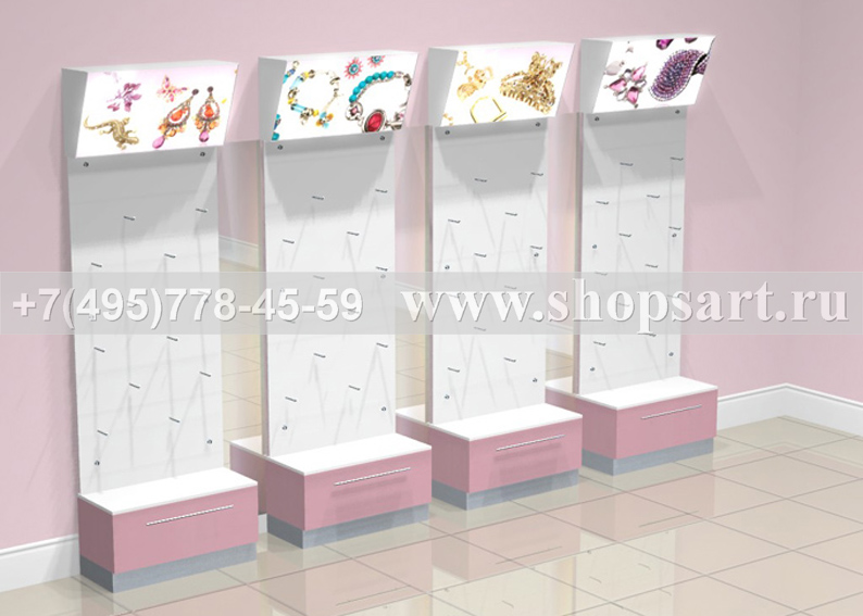 В верхней части торговых стеллажей располагаются световые короба с декоративным орнаментом или брендом товара. В нижней части расположены накопители с распашными дверками, или выдвижными ящиками. Настенные панели для бижутерии выполнены из белого глянцевого оргстекла с перфорацией. На панели для бижутерии устанавливаются прозрачные крючки из оргстекла. Стеллаж пристенный используется для выкладки и навески украшений и аксессуаров. Торговый стеллаж может комплектоваться полками, крючками любой длины. Цоколь накопителей можно изготовить из металлизированного пластика.