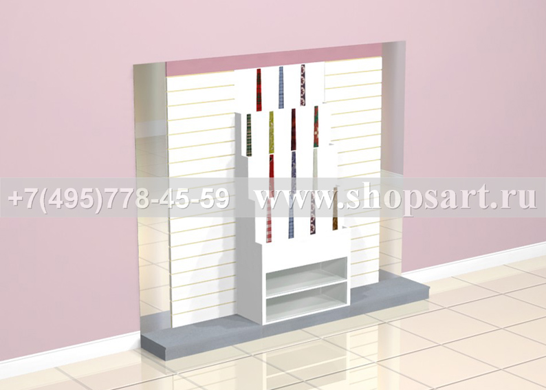 Торговый стеллаж, пристенный, используется для выкладки и навески нижнего мужского белья и одежды. В стеллаже использованы: стойки перфорированные 40х40х2400мм.; задние панели изготовлены из ЛДСП; накопитель с выдвижными ящиками размером 500(h)х1250х400мм.; подиум размером 100(h)х650х400мм.; кронштейны фронтальные 600мм., 900мм. или 1200мм., наклонные кронштейны; крючки из металла различной длины и любые аксессуары для навески и выкладки; полки из стекла изготовленные из ЛДСП или МДФ различной глубины на полкодержателях; ячейки в виде кубов ЛДСП; перфорированными стойками любой модификации. Стеллаж имеет квадратные блоки из ЛДСП для выкладки эксклюзивного товара, который необходимо выделить на фоне другой продукции. Перфорированные стойки могут устанавливаться на опоры и не нести нагрузку на стену, это важно для помещений, в которых не рекомендуется крепление к стене.