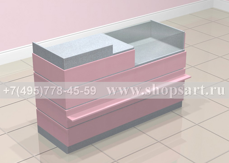 Торговый прилавок предназначен для выкладки, демонстрации и хранения товара, снабжен выдвижными ящиками. Прилавок имеет две стеклянные витрины: верхняя открывается с помощью выдвижной каретки, нижняя имеет распашные дверки с замком. Конструкция такого прилавка, позволяет выставить большое количество товара для демонстрации его покупателям. Основание прилавка изготовлено из ЛДСП. Цоколь прилавка можно изготовить из металлизированного пластика.