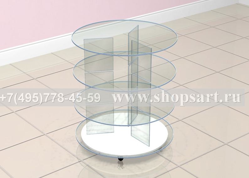 Стол торговый, островной, стеклянный, круглый служит для демонстрации сумок, аксессуаров. Основание стола выполнено из ЛДСП или высокоглянцевого МДФ. Стеклянный стол изготавливается из стекла 8 мм. Конструкция состоит из круглых столешниц, соединенных между собой вертикальными стеклянными элементами, склеенными при помощи ультрафиолета. Торговый стол снабжен колесиками, может передвигаться по торговому залу.