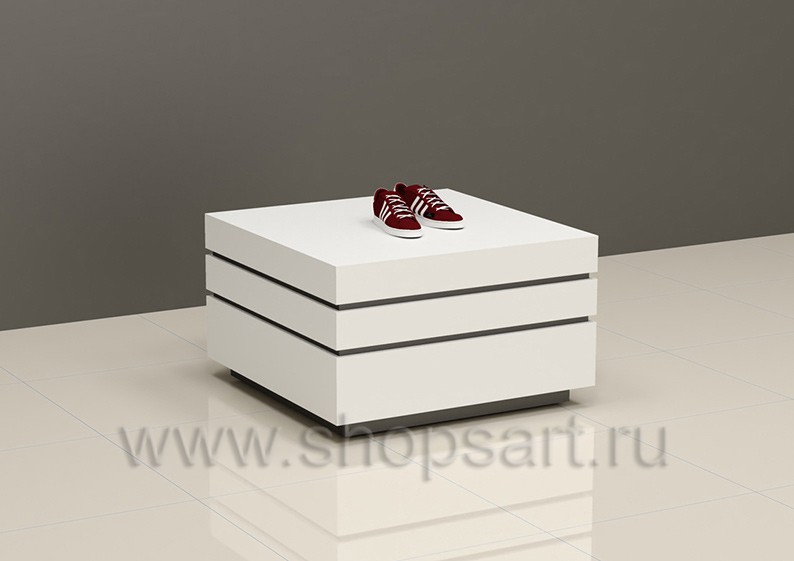 Подиум предназначен для оформления торговых витрин или островных конструкций в центре торгового зала для демонстрации обуви или сумок, поможет создать эксклюзивные островные конструкции в магазине или бутике небольшой площади. Изделие выполнено из комбинированного матового ЛДСП 16 мм.