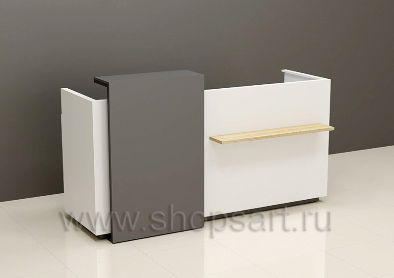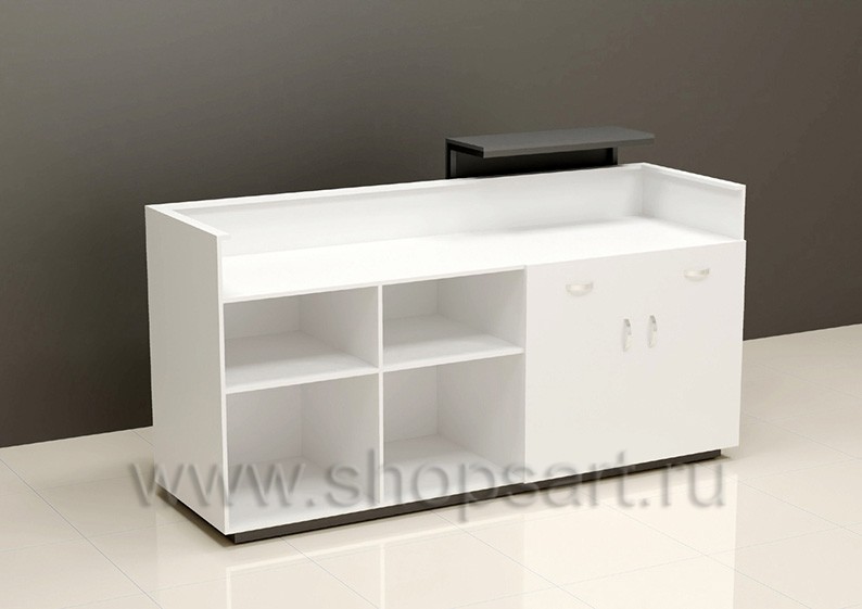 Стол для кассы имеет большую зону для упаковки товара. Место расположение кассы скрыто и защищено от покупателей. Каркас стола для кассы выполнен из белого, матового ЛДСП 16 мм с декоративной накладкой из чёрного, матового ЛДСП. Кассовый блок может иметь любое внутреннее наполнение: полки, дверки, шкафчики и ящики с фурнитурой полного выдвижения. Зона упаковки создаёт дополнительный комфорт в приобретении товара покупателем, удобна продавцу.