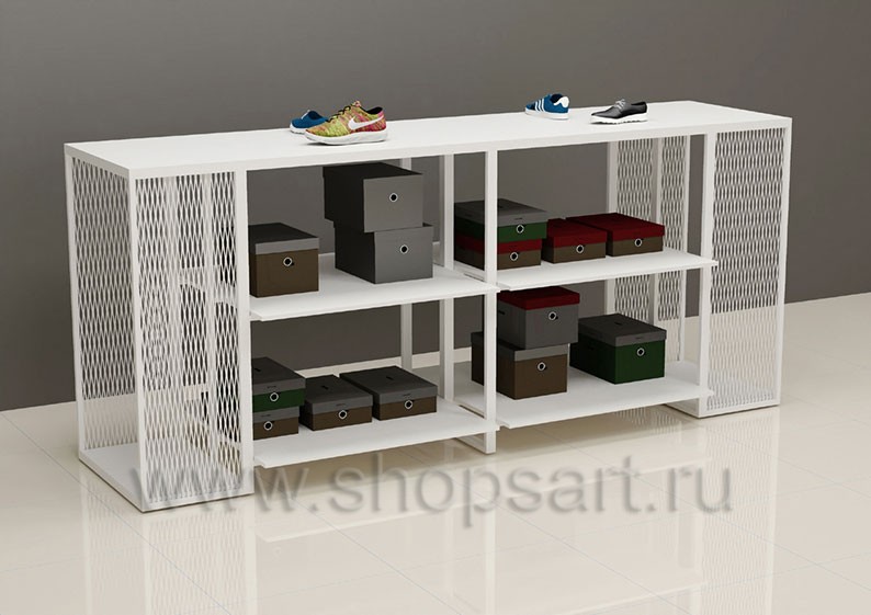 Тумба островная для магазина обуви, имеет открытую конструкцию с полочками, предназначена для оформления островных конструкций в торговом зале. Главным достоинством данной модели является то, что на верхней столешнице можно представить обувь, а на полочках дополнительно поместить размерный ряд товара. Каркас выполнен из металлической квадратной трубы 25×25 мм с покрытием порошковой краской белого, матового цвета.