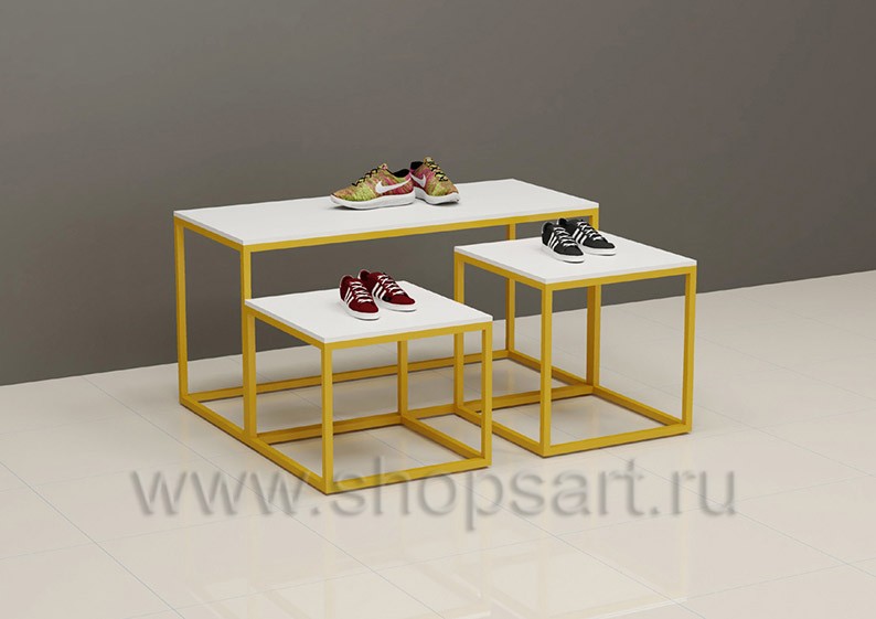 Комплект островных демонстрационных столов предназначен для выкладки товара, устанавливаются в центре торгового зала или используются для оформления витрин. Каркас столов выполнен из квадратной трубы 25×25 мм с покрытием порошковой краской, цвет матовое золото. Столешницы выполнены из белого, матового ЛДСП 16 мм. Габаритные размеры и цвет могут быть изменены по согласованию с заказчиком.
