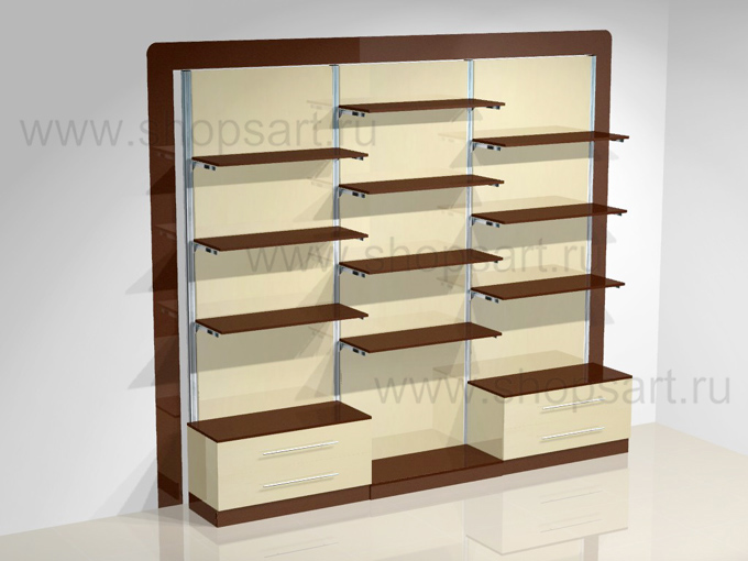 Стеллажи пристенные из 3-х модулей обрамляет декоративная рама, которая позволяет выделить торговую зону в магазине и привлечь внимание покупателей к товару, выложенному на стеллажах. Торговые стеллажи имеют в своем составе: глянцевые полки на полкодержателях 300мм. (хром); перфорированные стойки на опорах, возможны стойки с креплением к стене; задние панели из ЛДСП; накопитель с верхней частью из высокоглянцевого МДФ. В нижней части стеллажа устанавливается накопитель с выдвижными ящиками.Подробнее
