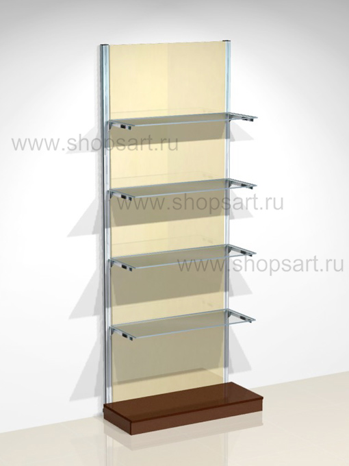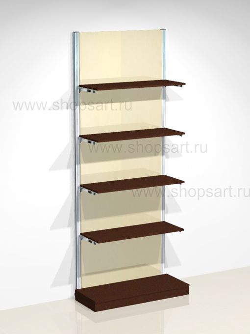 Стеллаж пристенный используется для демонстрации обуви. Торговый стеллаж имеет в своем составе: стеклянные полки 8 мм. на полкодержателях 300мм. (хром); перфорированные стойки на опорах, возможны стойки с креплением к стене; задние панели из ЛДСП; подиум из высокоглянцевого МДФ. В нижней части устанавливается подиум, который можно использовать для выкладки высокой обуви.Подробнее