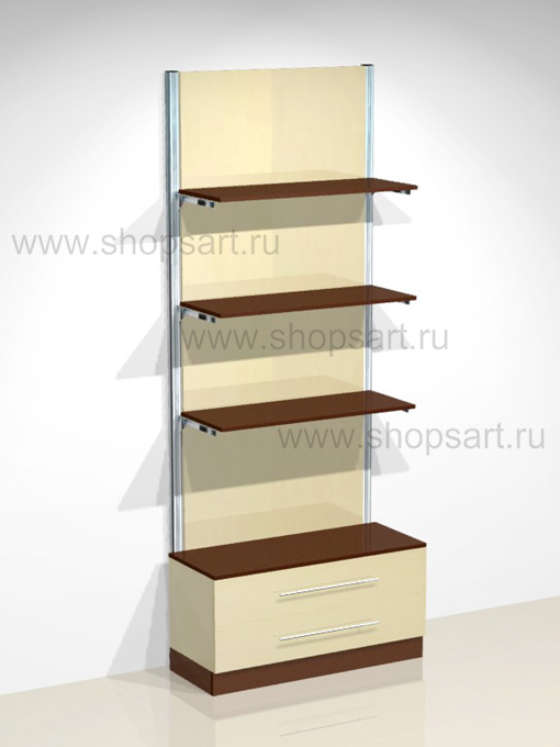 Стеллаж пристенный используется для демонстрации обуви. Торговый стеллаж имеет в своем составе: стеклянные полки 8 мм. на полкодержателях 300мм. (хром); перфорированные стойки на опорах, возможны стойки с креплением к стене; задние панели из ЛДСП; накопитель с верхней частью из высокоглянцевого МДФ. В нижней части стеллажа устанавливается накопитель с выдвижными ящиками.Подробнее