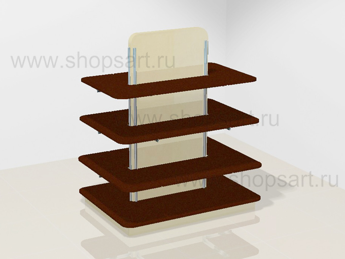 Стойка островная используется для выкладки и демонстрации обуви, одежды, аксессуаров. Стойка производится из высокоглянцевого МДФ или ЛДСП, перфорированных стоек, металлической хромированной трубы d25 мм., стекла 8мм. Стойка с двухсторонней выкладкой используется для выкладки обуви и навески одежды, удобна для просмотра товара. Островная стойка для обуви устанавливается в центре зала.Подробнее