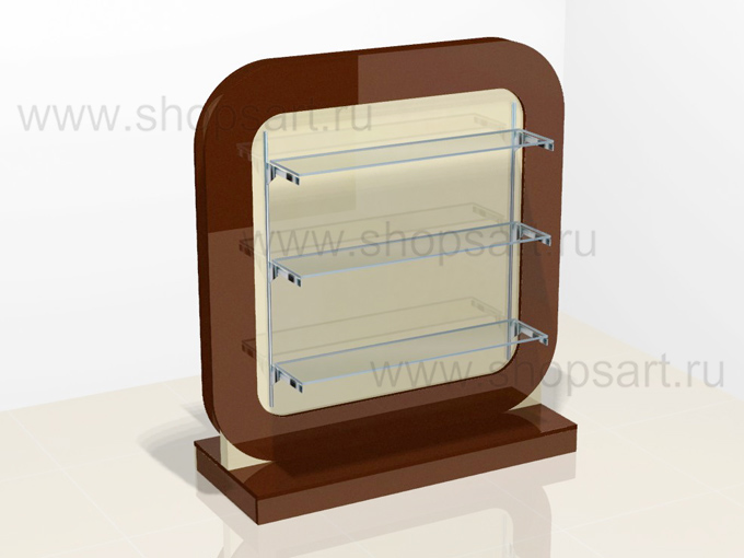 Торговое оборудование из 3-х модулей пристенных стеллажей обрамляет декоративная рама, которая позволяет выделить торговую зону в магазине и привлечь внимание покупателей к товару, выложенному на стеллажах. Торговые стеллажи имеют в своем составе: стеклянные полки 8 мм. на полкодержателях 300мм. (хром); глянцевые полки на полкодержателях 300мм. (хром); перфорированные стойки на опорах, возможны стойки с креплением к стене; задние панели из ЛДСП; подиумы из высокоглянцевого МДФ. Одна из основных стоек в магазинах самообслуживания.Подробнее
