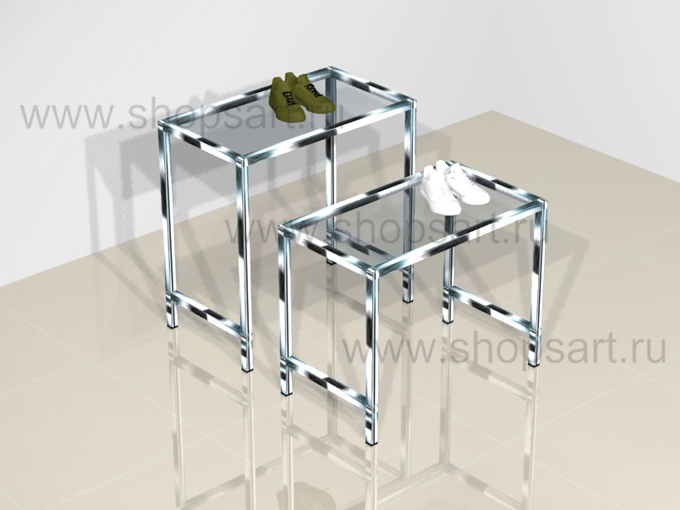 Столики используются для выкладки обуви, одежды и аксессуаров, удобны для демонстрации высокой обуви, новых коллекций. Благодаря оригинальному дизайну, гармонично сочетающему хромированный металл и стекло, столики привлекают внимание покупателей. Островная конструкция удобна для выкладки и просмотра товара. Столики используются для выкладки товара в центре зала и оформления витрин.Подробнее