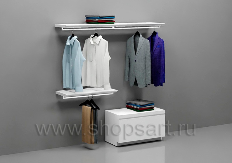 Торговое оборудование для одежды в виде полок с креплением к стене и накопителем с выдвижным ящиком. На полки в нижней части устанавливаются кронштейны для навески одежды. Полки крепятся к стене при помощи кронштейнов. Эта конструкция требует усиления стены или крепления непосредственно на несущую стену из бетона или кирпича. Под полкой возможна установка светодиодного освещения для подсветки товара.