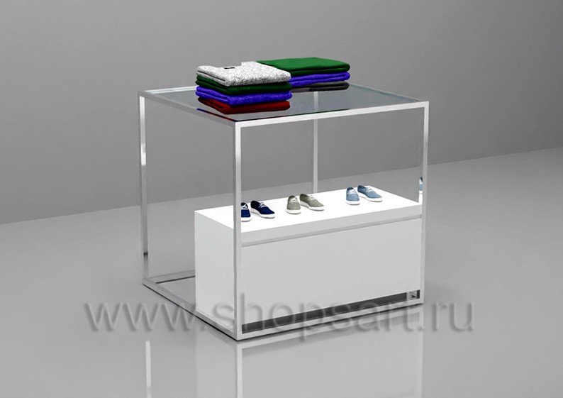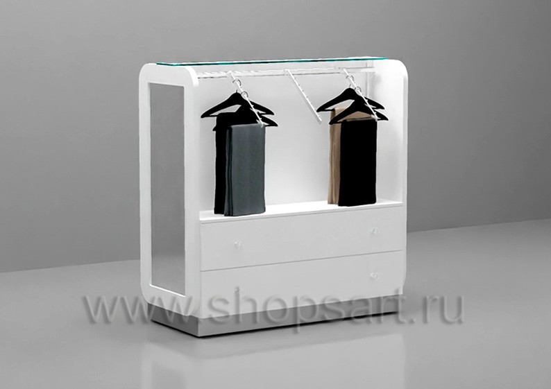 Островная стойка, имеет открытую конструкцию, предназначена для демонстрации одежды, оснащена стеклянными полками для выкладки товара. В нижней части стойки установлены накопители для хранения товара. Каркас стойки выполнен из сварной, металлической трубы с покрытием порошковой краской. Накопители выполнены из белого, матового ЛДСП 16 мм.
