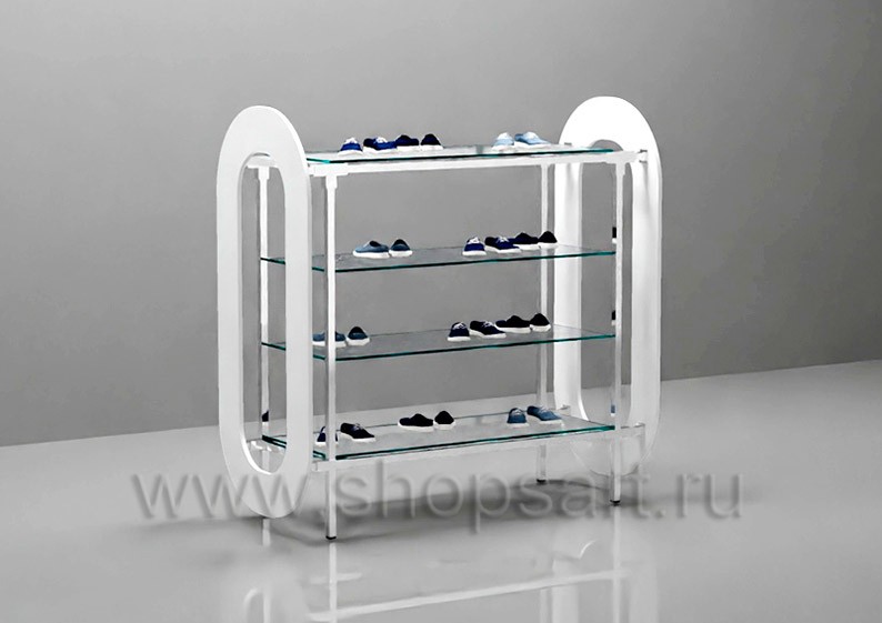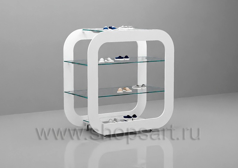 Островная гондола предназначена для демонстрации обуви, оснащена стеклянными полочками для размещения товара. Изделие устанавливают в центре торгового зала или используют для оформления витрин магазина. Гондола позволяет обеспечить дополнительную выкладку сопутствующего товара. Каркас выполнен из металлической окрашенной квадратной трубы 25×25 мм. Полочки для выкладки товара выполнены из стекла 8 мм.