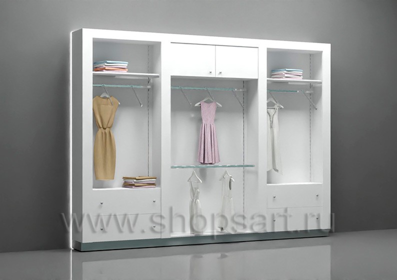 Шкаф предназначен для демонстрации одежды и выкладки товара, укомплектован навесными кронштейнами для фронтальной и боковой развески одежды. В нижней части торговых секций установлен демонстрационный подиум, на котором можно представить обувь и накопители с выдвижными ящиками для хранения товара. Стеллаж выполнен из белого, матового ЛДСП. Навесные кронштейны для одежды изготовлены из металла с покрытием порошковой краской.