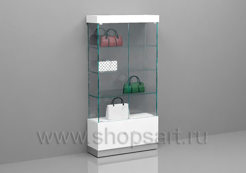 Стеклянная витрина для магазина одежды служит для выкладки аксессуаров, сопутствующих товаров – бижутерии, сумок, перчаток и т.д. Дверки стеклянные, распашные с замком. Стекло толщиной 6-8мм. Витрина может быть оснащена светодиодной подсветкой, расположенной сверху и под каждой полкой. Внизу расположена тумба-накопитель.