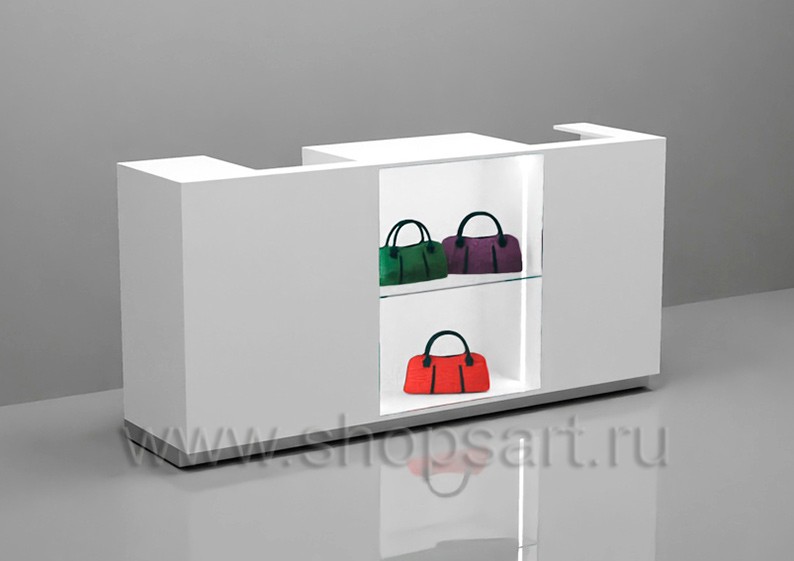 Кассовый стол рассчитан на два рабочих места. Каркас изготавливается из ЛДСП или окрашенного МДФ, цвет белый. В центральной части расположена витрина с подсветкой для размещения аксессуаров. Внутренне наполнение кассового стола: выдвижной ящик с запиранием на ключ, полка, или любое другое наполнение по желанию заказчика.