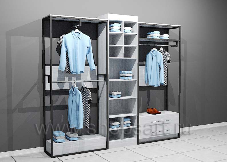 Блок пристенных, торговых стеллажей состоит из трёх модулей. Оборудование для одежды представлено в виде торговых стеллажей, имеет разнообразную навеску и выкладку товара. В композиции из стеллажей присутствует и запасник для товара и подиум для демонстрации обуви. Ячейки и полки можно использовать для выкладки рубашек и трикотажа. Торговое оборудование для одежды имеет легкий вид, не создает перегруженности в интерьере, привлекает внимание покупателей.