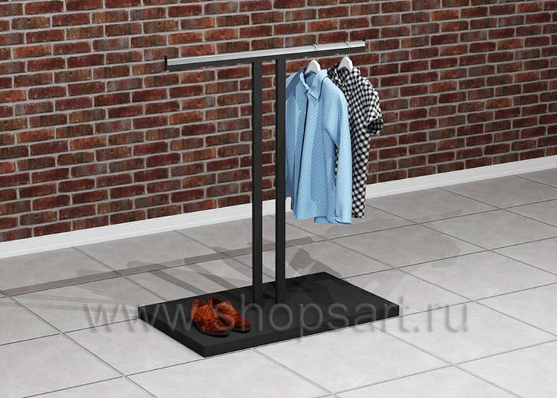 Торговая, островная Т-образная стойка для навески одежды и выкладки сопутствующего товара. В нижней части этой островной стойки расположен массивный подиум, выполненный из металла. Верхняя часть этой стойки-вешала, в зоне соприкосновения плечиков с одеждой, облицовывается П- образным профилем из нержавейки, тем самым предохраняя окрашенную поверхность стойки от царапин и повреждений.