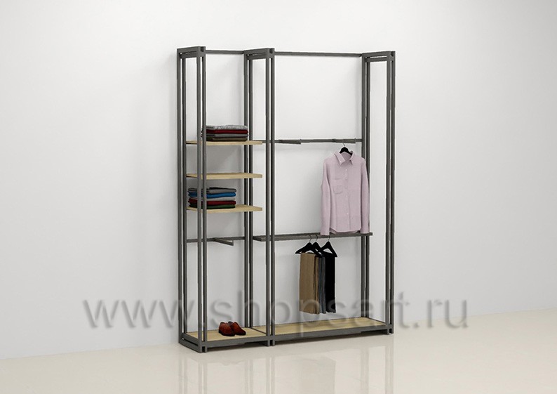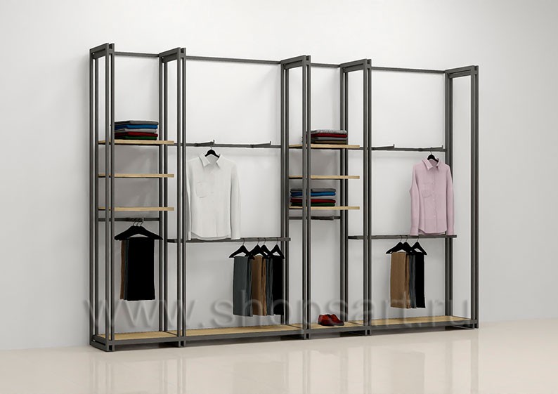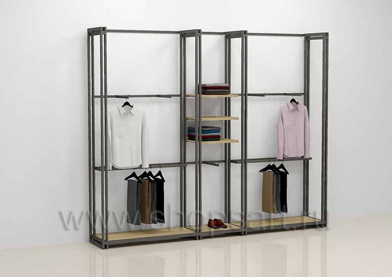 Этот стеллаж состоит из набора отдельно стоящих стеллажей, каркас выполнен из металла “под нержавейку”, покрытого бесцветным лаком со скрытой перфорацией для установки навесных кронштейнов. Торговые секции оснащены разнообразной навеской для красивой и презентабельной демонстрации одежды и выкладки товара. В нижней части устанавливается полочка из матового ЛДСП 16 мм, цвет «под дерево», для дополнительного размещения обуви или аксессуаров.