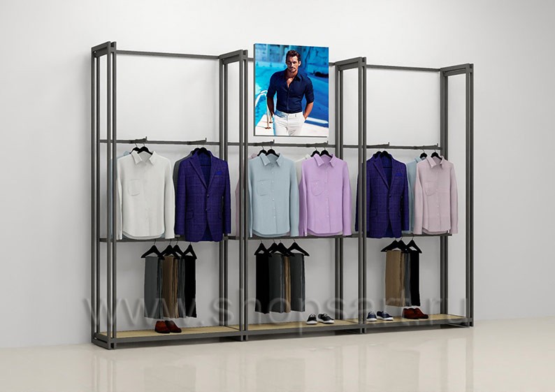Торговый стеллаж выполнен из металла с эффектом “под нержавейку” и покрытием бесцветным лаком. В центральной части стеллажа располагается узкая секция для выкладки одежды из трикотажа, которая оснащена фронтальным и прямым кронштейном. Сверху монтируется световой короб. Большие, боковые секции стеллажа имеют фронтальную навеску, предназначены для демонстрации рубашек, пиджаков. Нижняя торговая секция оснащена П-образными кронштейнами для размещения брюк.