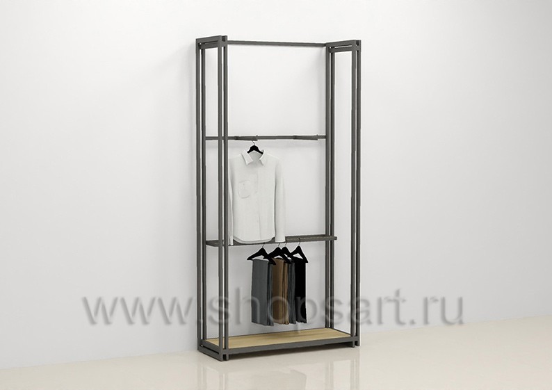 Стеллаж для одежды выполнен из металла “под нержавейку” с покрытием матовым лаком. Торговая секция оснащена прямым кронштейном для демонстрации одежды “лицом” и П-образным кронштейном для боковой развески. В нижней части стеллажа установлена полочка из матового ЛДСП 16 мм, цвет «под дерево», для дополнительной демонстрации обуви или сумок, так же она позволяет защитить товар от загрязнения при падении.