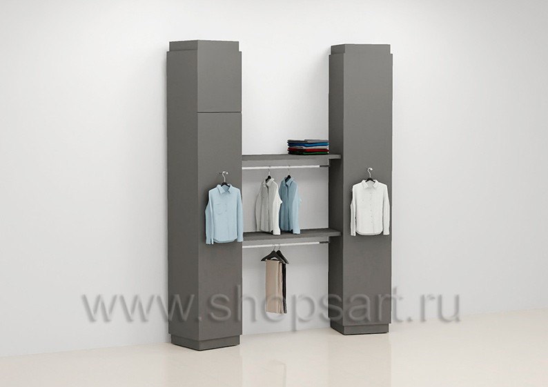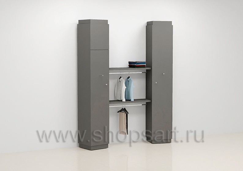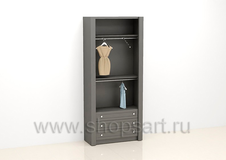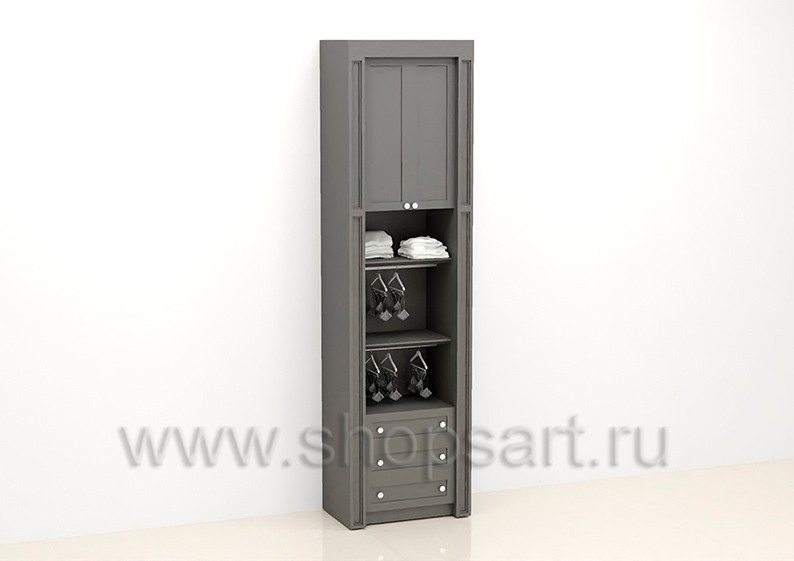 Шкаф в основном используется в магазинах мужской одежды. В нижней открытой секции расположено отделение для боковой демонстрации брюк. В верхней части открытая секция предназначена для фронтальной навески рубашек. Центральная часть шкаф оснащена выдвижными ящиками для аксессуаров. Изделие может быть выполнено из окрашенного МДФ или изготовлено из ЛДСП.