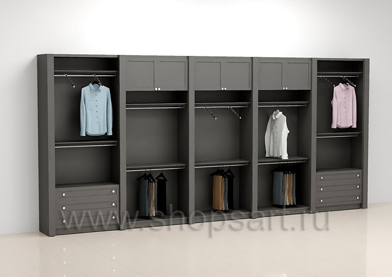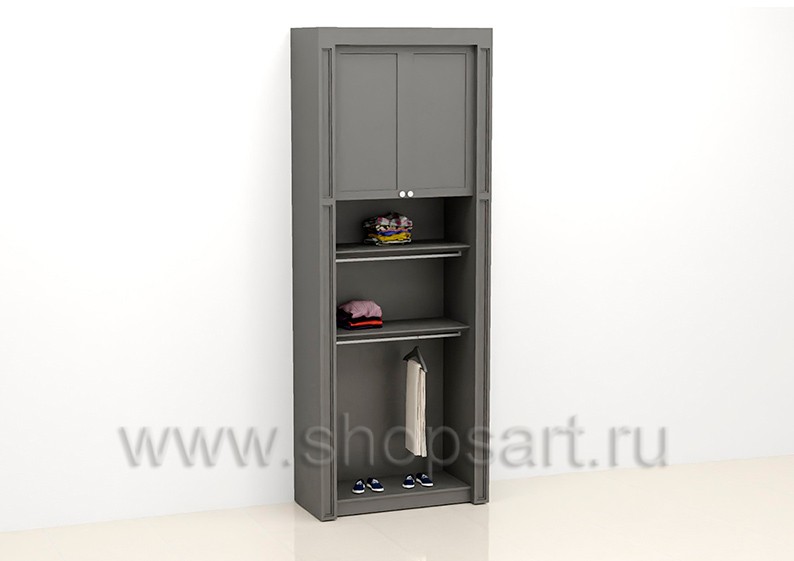 Этот шкаф — отдельная зона для демонстрации классической, мужской одежды, используется в магазинах премиум класса. Верхние секции предназначены для демонстрации рубашек, пиджаков, костюмов. Нижняя секция торгового шкафа предназначена для размещения брюк. Торговые секции укомплектованы накопителями с выдвижными ящиками и антресолями с распашными дверками для хранения размерного ряда одежды. Дополнительно в шкаф может быть установлена светодиодная подсветка.
