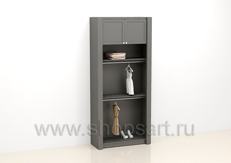 Шкаф торговый с полочками и кронштейнами, используется для демонстрации одежды и выкладки товара. В верхней части предусмотрен накопитель с распашными дверками для дополнительного хранения товара. В нижней части изделия присутствует подиум, который можно использовать для демонстрации обуви или сумок. Шкаф выполнен из МДФ или изготовлен из ЛДСП.