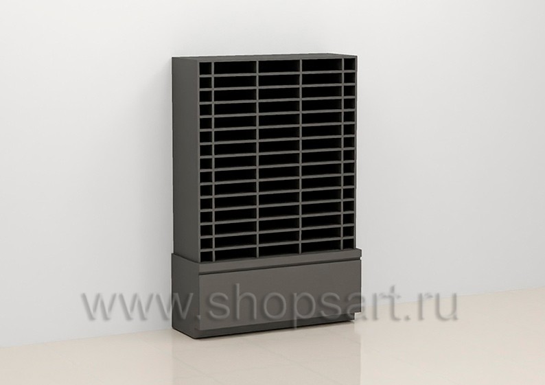 Пристенный, торговый стеллаж предназначен для выкладки галстуков и рубашек в магазинах одежды для мужчин, используется при оформлении пристенных конструкций. Рубашки выкладываются по одной, две штуки в узкие ячейки, горизонтально. В нижней части расположен накопитель с выдвижным ящиком для сортировки и дополнительного хранения товара. Дверцы накопителя не имеют ручек, открываются с помощью толкателей. Боковые ячейки стеллажа используются для выкладки ремней или галстуков. Стеллаж выполнен из МДФ, окрашен цветом «Графит» и покрыт матовым лаком. Изделие может быть выполнено из ЛДСП в любом цвете материала.