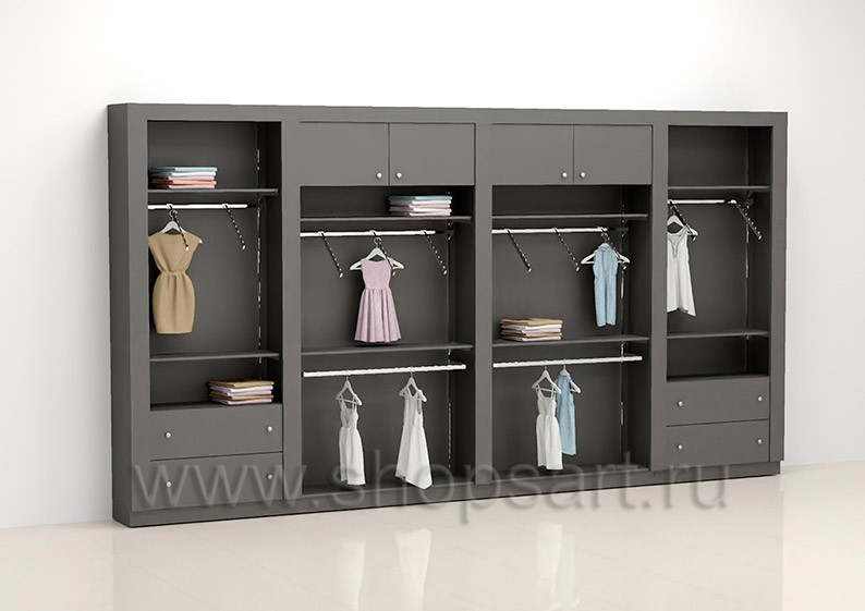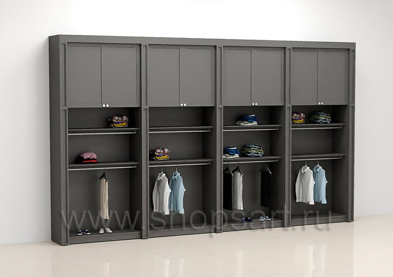 Шкаф для демонстрации одежды и хранения товара, состоит из четырех торговых секций. Торговые секции оснащены в верхней части накопителями с распашными дверками, в нижней части установлены накопители с выдвижными ящиками. В средней части установлены полки для выкладки товара и кронштейны для навески одежды. Навесные кронштейны взаимозаменяемы и регулируются по высоте. Стеллаж изготовлен из окрашенного МДФ с покрытием матовым лаком или может быть выполнен из ЛДСП.
