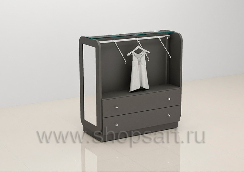 Стойка для одежды с запасниками в виде выдвижных ящиков и кронштейнами для одежды используется при оформлении островных конструкций в центральной части магазина. На боковые стенки устанавливаются зеркала в овальной раме или экономпанель для аксессуаров или сопутствующих мелкогабаритных товаров.