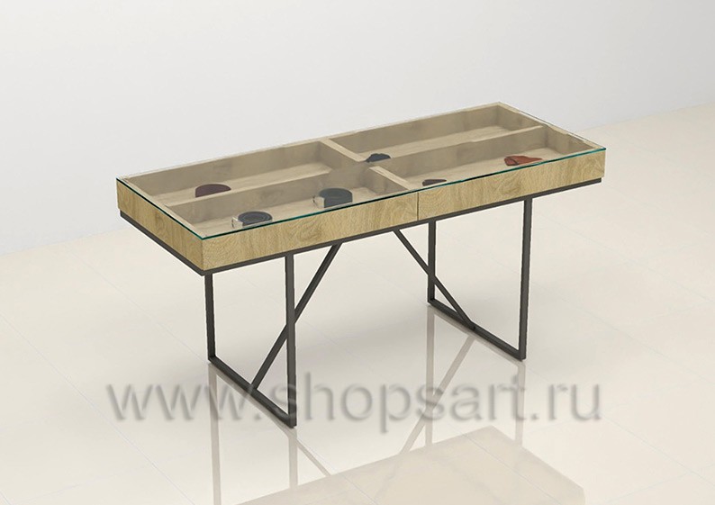 Стол для аксессуаров, островной устанавливается на металлический каркас. Металлический каркас покрыт лаком “под нержавейку”. В верхнюю часть стола устанавливается конструкция в виде четырех выдвижных ящиков. В ячейки под стеклом можно выкладывать различные группы продукции, что позволяет создавать зоны для многих видов товара или аксессуаров.