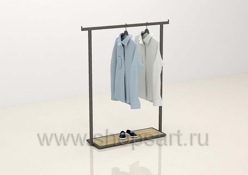 Вешало напольное предназначено для демонстрации одежды на плечиках, служит для оформления островных конструкций в центральной части магазина или при оформлении витрин. Каркас изделия выполнен из квадратной, металлической трубы 25×25 мм “под нержавейку” с покрытием прозрачным лаком. В нижней части устанавливается полка из матового ЛДСП цветом «под дерево».