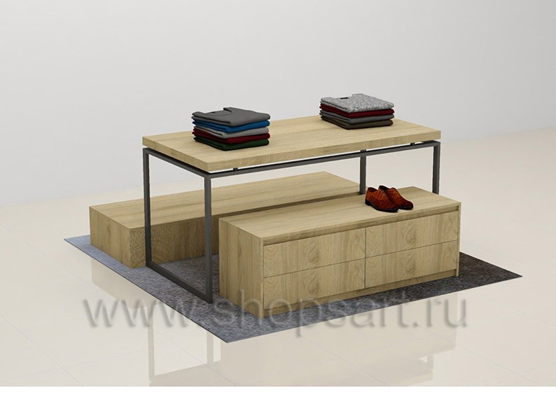 Островной модуль представлен в виде комода с выдвижными ящиками, подиума и демонстрационного стола для выкладки товара. На демонстрационном подиуме можно установить манекен или использовать для выкладки обуви. Расположенный в центральной части демонстрационный стол, выполнен на сварном металлическом каркасе с покрытием лаком “под нержавейку”, предназначен для презентабельной выкладки одежды из трикотажа, обуви или сумок.