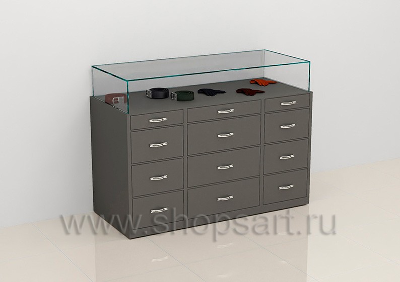 Комод с выдвижными ящиками выполнен в классическом стиле, состоит из стеклянной, открытой с фасада витрины, служит для демонстрации аксессуаров, ремней, платков, украшений, перчаток. Комод имеет множество выдвижных ящиков-накопителей для удобного хранения и сортировки товара. Размеры могут быть любыми другими.