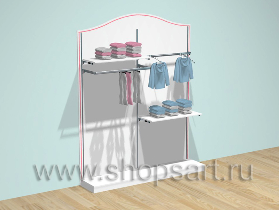 Стеллаж пристенный используется для демонстрации одежды. На перфорированные стойки устанавливаются как различного рода П-образные кронштейны с фронтальными крючками, так и полки стеклянные или из ЛДСП. В нижней части устанавливаются накопители с выдвижными ящиками на направляющих полного выдвижения или распашными дверками. Стеллаж имеет двойную навеску с шагом 900мм.