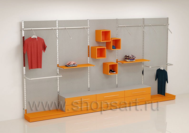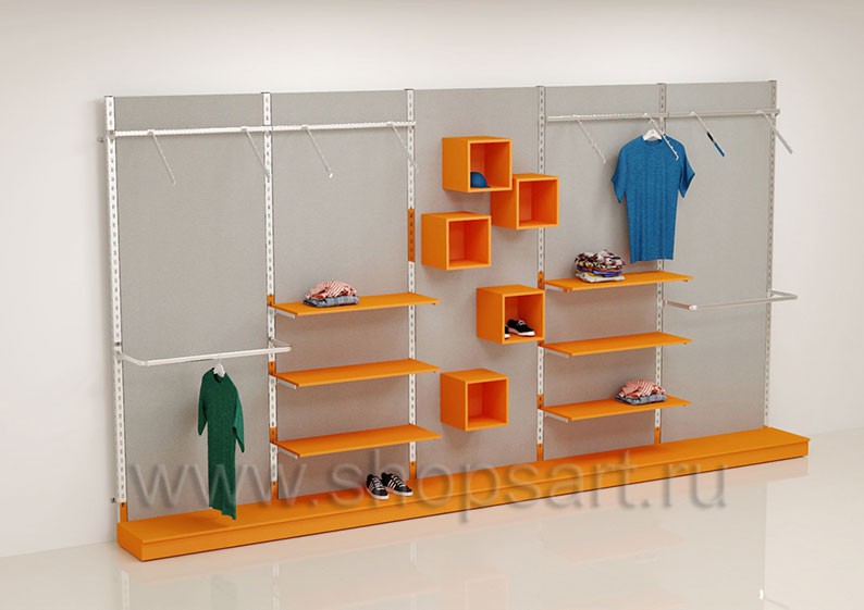 В пристенном стеллаже используются перфорированные стойки 40х40х2400мм, цвета “хром”; задняя панель серый ЛДСП; кубы и подиум из оранжевого ЛДСП. На стенку торгового стеллажа устанавливаются кубы для демонстрации бейсболок или обуви. В нижней части стеллажа устанавливается подиум для демонстрации высокой обуви или сумок. Торговое оборудование может комплектоваться полками из ЛДСП, МДФ, стекла различной глубины, перфорированными стойками любой модификации. Стойки могут оснащаться любыми кронштейнами шириной 600мм, 900мм, 1200мм и аксессуарами для навески и выкладки. Цоколь можно изготовить из металлизированного пластика.