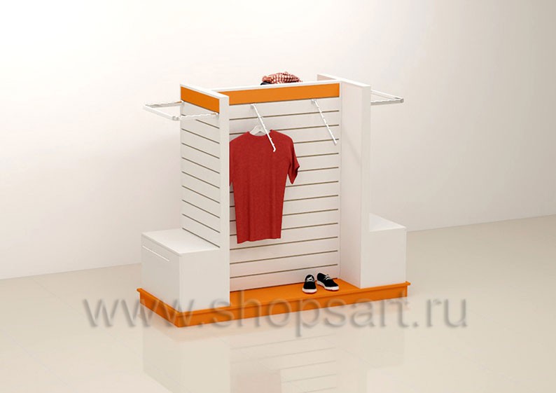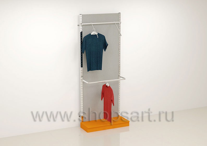 В торговом стеллаже используются: перфорированные стойки 40х40х2400 мм, цвета “хром”; задняя панель серый ЛДСП; подиум оранжевого ЛДСП; фронтальный кронштейн; наклонные кронштейны. В нижней части стеллажа устанавливается подиум. Стеллаж пристенный используется для выкладки и навески одежды, обуви и других товаров. Торговое оборудование может комплектоваться полками из ЛДСП, МДФ, стекла различной глубины, перфорированными стойками любой модификации. Стойки могут оснащаться любыми кронштейнами шириной 600мм, 900мм, 1200мм. и аксессуарами для навески и выкладки. Цоколь можно изготовить из металлизированного пластика.