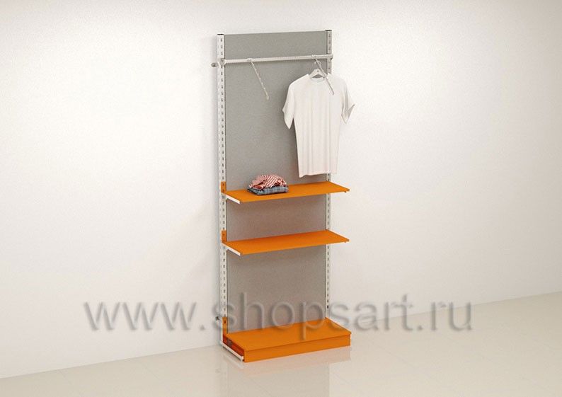 В пристенном стеллаже используются: перфорированные стойки 40х40х2400мм, цвета “хром”; задняя панель серый ЛДСП; полки и ящики накопителя из оранжевого ЛДСП; фронтальный кронштейн; наклонные кронштейны. В нижней части стеллажа устанавливается накопитель с выдвижными ящиками 1000х400х500мм. Стеллаж пристенный используется для выкладки и навески одежды, обуви и других товаров. Торговый стеллаж может комплектоваться полками из ЛДСП, МДФ, стекла различной глубины, перфорированными стойками любой модификации. Стойки могут оснащаться кронштейнами шириной 600мм, 900мм, 1200мм и аксессуарами для навески и выкладки.