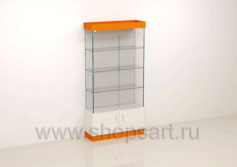 Стеклянная витрина предназначена для выкладки и демонстрации товара. Дверки стеклянные, распашные с замком. В нижней части витрины расположен накопительный ящик с распашными дверками. Накопитель может комплектоваться выдвижными ящиками на направляющих полного выдвижения. Материал МДФ суперглянец или матовый ЛДСП. Возможно производство витрины из других материалов.