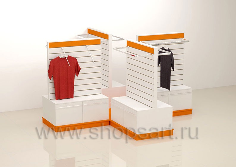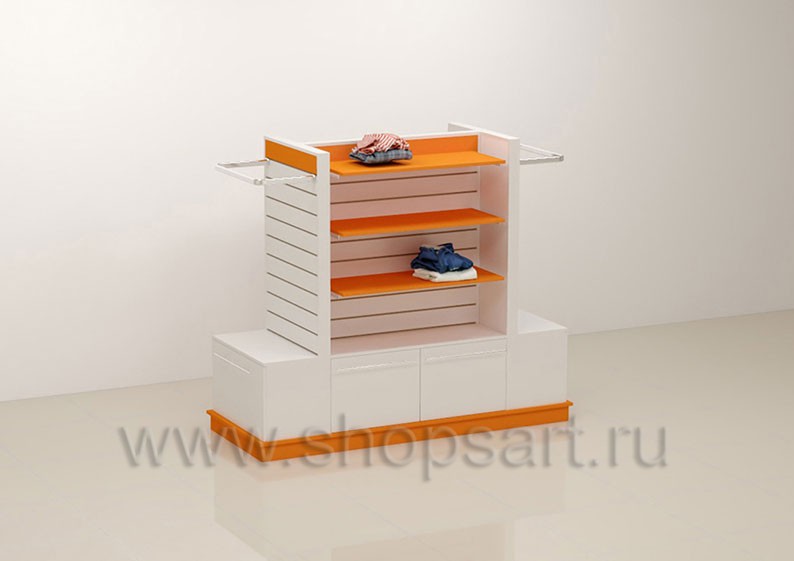 Торговый остров, двусторонний используется для навески одежды и других товаров. Торговый остров для одежды произведён на базе экономпанелей, и 4-х накопителей 400(h)х1000х300мм. Комплектуется фронтальными и П-образными кронштейнами L= 900мм., навесными элементами цвета “хром”. Накопители могут быть с распашными дверками или с выдвижными ящиками. Остров может комплектоваться полками из ЛДСП, МДФ, стекла различной глубины, перфорированными стойками любой модификации (вместо экономпанелей), кронштейнами шириной 600мм, 900мм, 1200мм и аксессуарами для навески и выкладки товара цвета “хром”, “серый” и “сатин”. Данное торговое оборудование часто используется в магазинах спортивной одежды. На стойку для одежды можно нанести логотип или торговую марку товара и использовать ее как брендовую стойку.